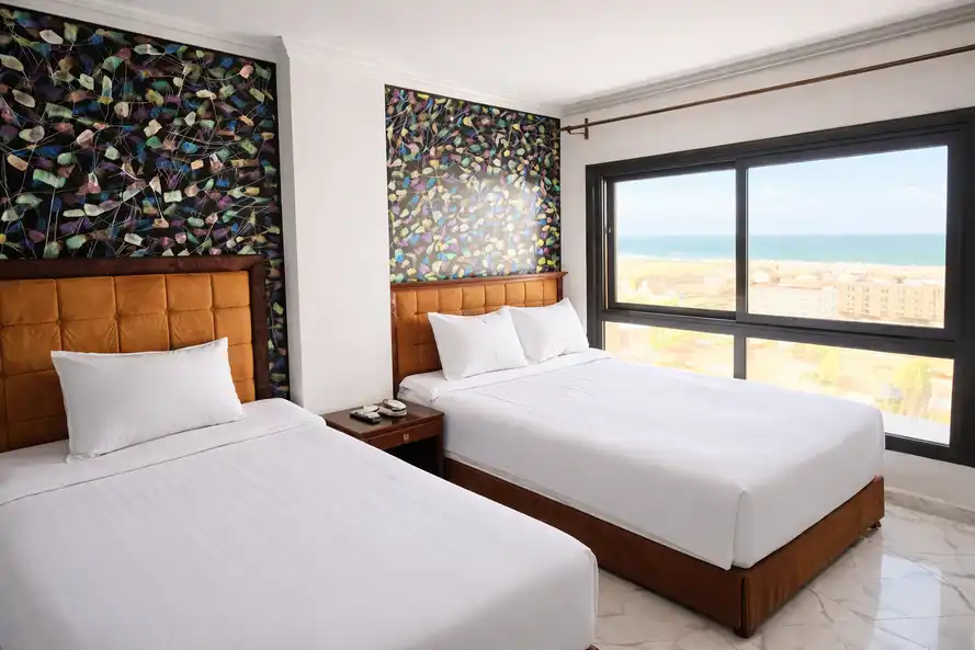 شاليه غرفه وصاله يسع اسره بحد اقصى 4 بالغين وطفلين الغرفه مكيفه سرير 160 سم وشاشه تليفزيون وحمام داخلى والصاله مكيفه بها كنبه تفتح سرير وشاشه تليفزيون ومطبخ به جميع الاجهزه وحمام سخن وبارد وتراس مطله على البحر وحمامات السباحه دور رابع