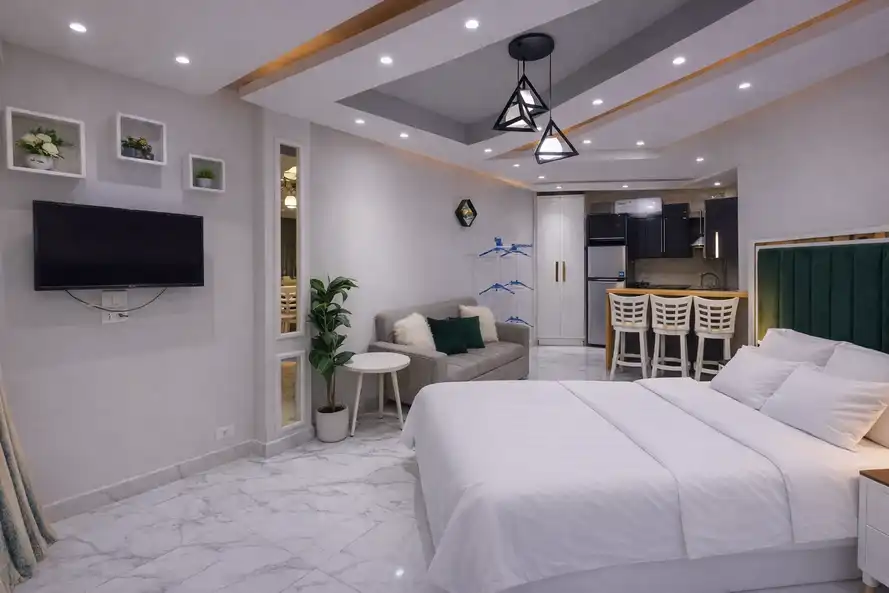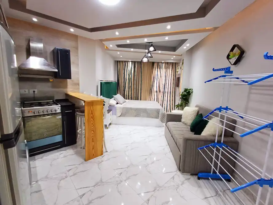 شاليه استوديو يسع لاسره صغيره زوج وزوجه وطفلين مكيف بمطبخ امريكان وحمام فيو بحر دور ثانى باسانسير