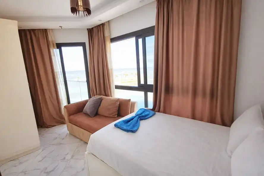شاليه استوديو يسع لاسره صغيره زوج وزوجه وطفلين مكيف بمطبخ امريكان وحمام فيو بحر دور ثانى باسانسير
