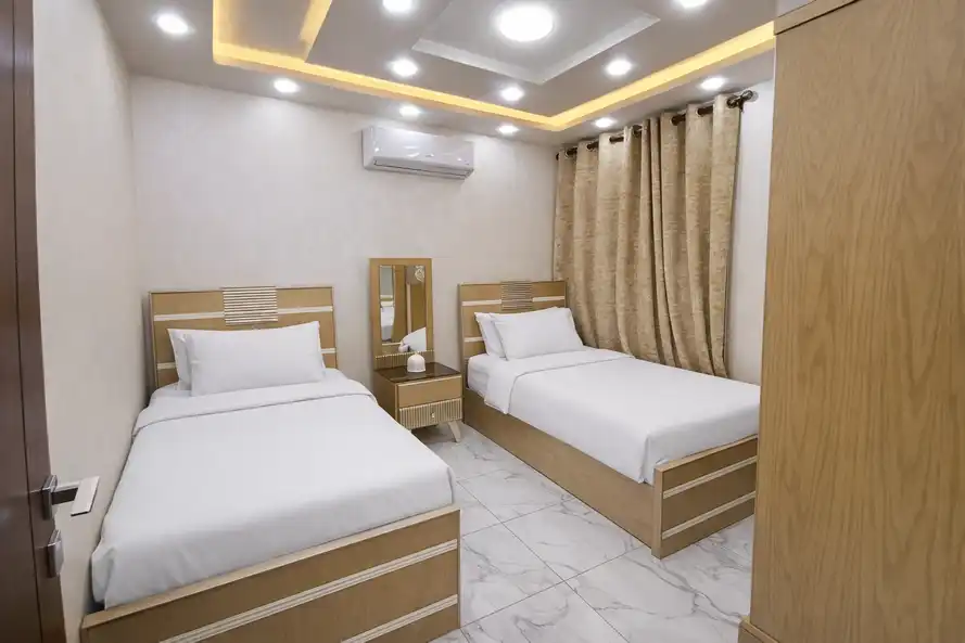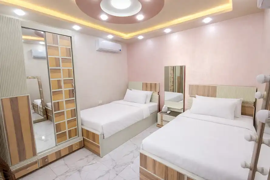 غرفه ماستر بحمام مكيفه و2غرفه دبل بها عدد 2 سرير 120سم مكيفه ومطبخ كامل الاجهزه والحمامات سخن وبارد دور ثانى