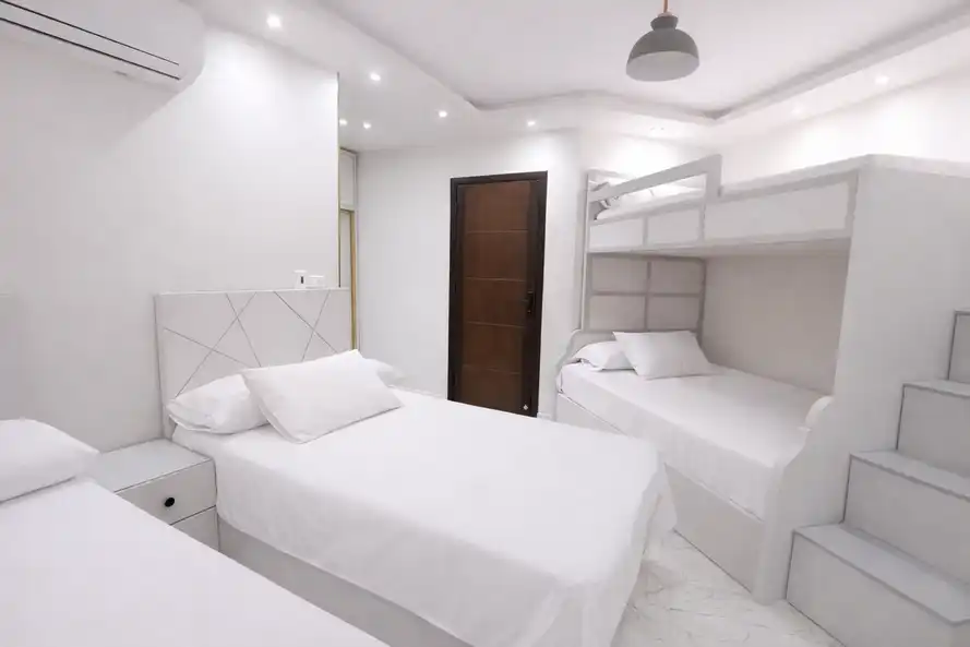 غرفه ماستر بحمام مكيفه و2غرفه دبل بها عدد 2 سرير 120سم مكيفه ومطبخ كامل الاجهزه والحمامات سخن وبارد دور ثانى