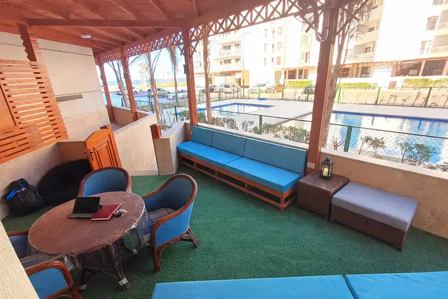 شاليه غرفتين وصاله ارضى بجاردن يسع لاسره بحد اقصى 5 بالغين واطفال باطلاله على البحر وحمامات السباحه ومطبخ و2 حمام و2 غرفه كل غرفه بها عدد 2 سرير 120سم مكيفه ومطبخ كامل الاجهزه والحمامات سخن