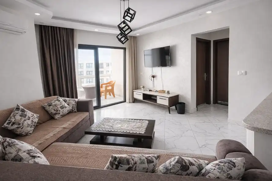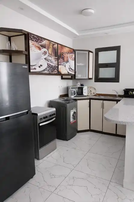 غرفه ماستر بحمام مكيفه و2غرفه دبل بها عدد 2 سرير 120سم مكيفه ومطبخ كامل الاجهزه والحمامات سخن وبارد دور ثانى