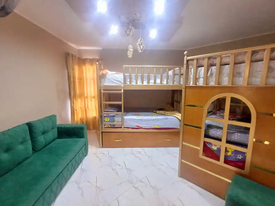 غرفه ماستر بحمام مكيفه و2غرفه دبل بها عدد 2 سرير 120سم مكيفه ومطبخ كامل الاجهزه والحمامات سخن وبارد دور ثانى