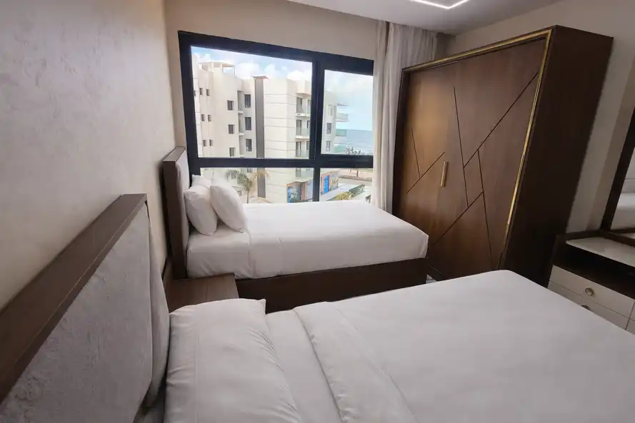 غرفه ماستر بحمام مكيفه و2غرفه دبل بها عدد 2 سرير 120سم مكيفه ومطبخ كامل الاجهزه والحمامات سخن وبارد دور ثانى