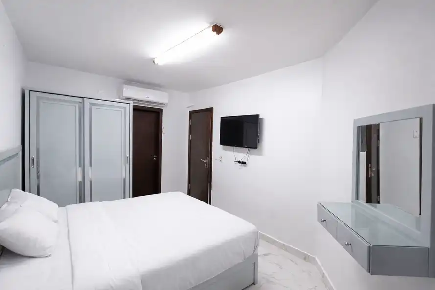 *غرفه نوم مكيفه بها سرير 160سم وشاشه تليفزيون ودولاب وتسريحه وحمام داخلى دور رابع