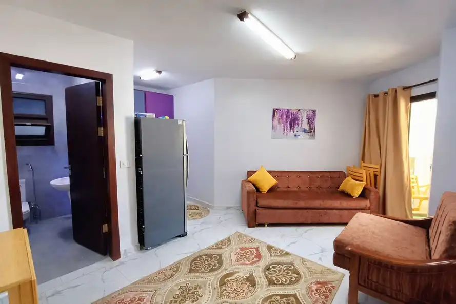 استوديو فندقى باطلاله على حمامات السباحه يسع لاسره صغيره بحد اقصى زوج وزوجه و طفلين مكيف به حمام ومطبخ كامل الاجهزه وعدد سرير 160 سم وكنبه تفتح سرير وشاشه تليفزيون فى الدور الثالث