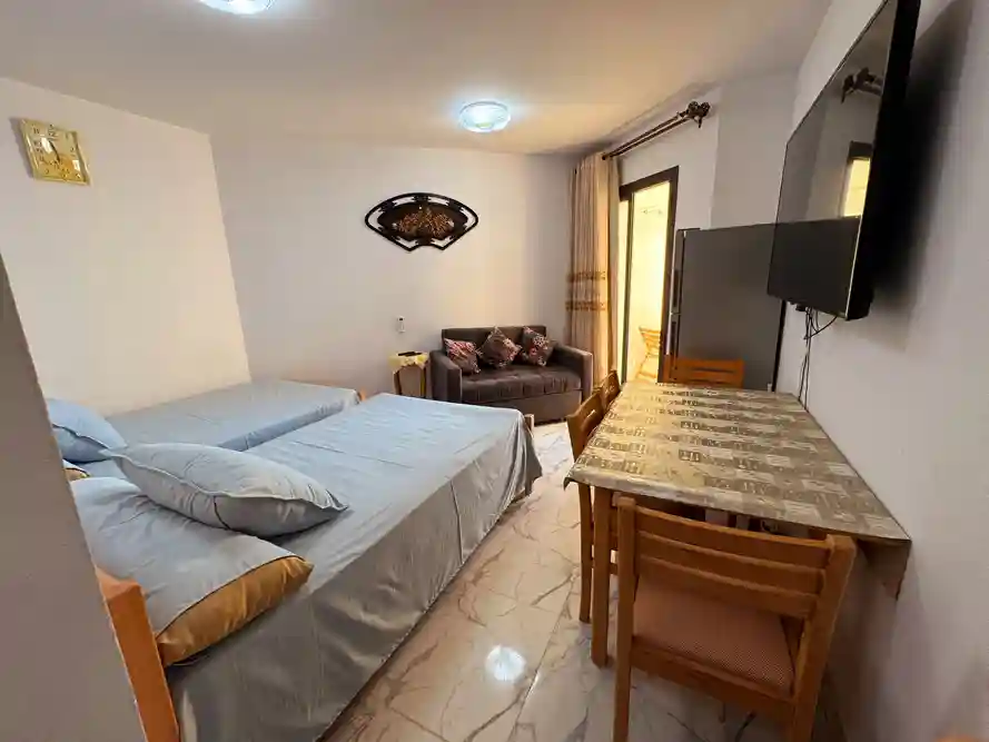 استوديو فندقى باطلاله على حمامات السباحه يسع لاسره صغيره بحد اقصى زوج وزوجه و طفلين مكيف به حمام ومطبخ كامل الاجهزه وعدد سرير 160 سم وكنبه تفتح سرير وشاشه تليفزيون فى الدور الثالث